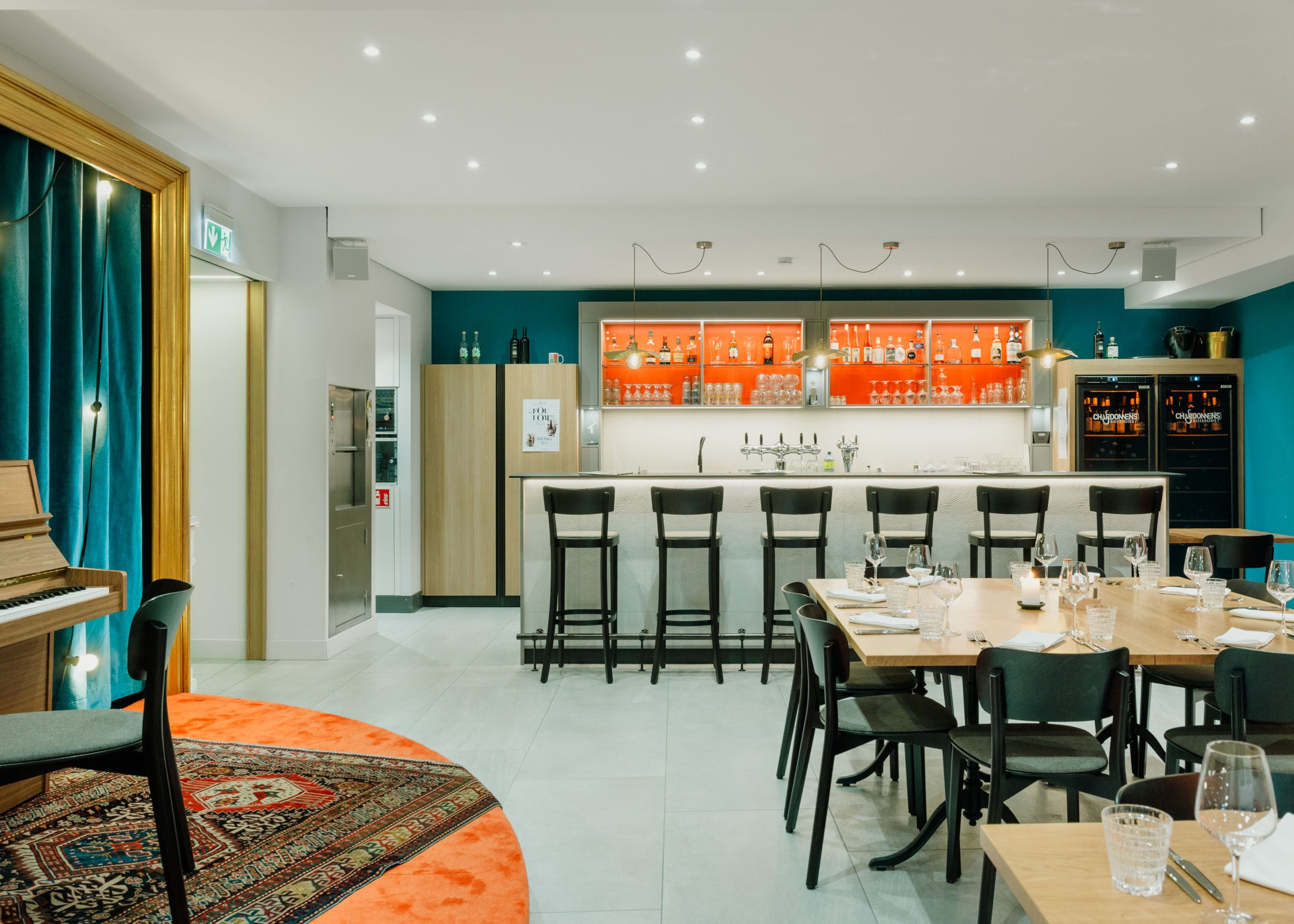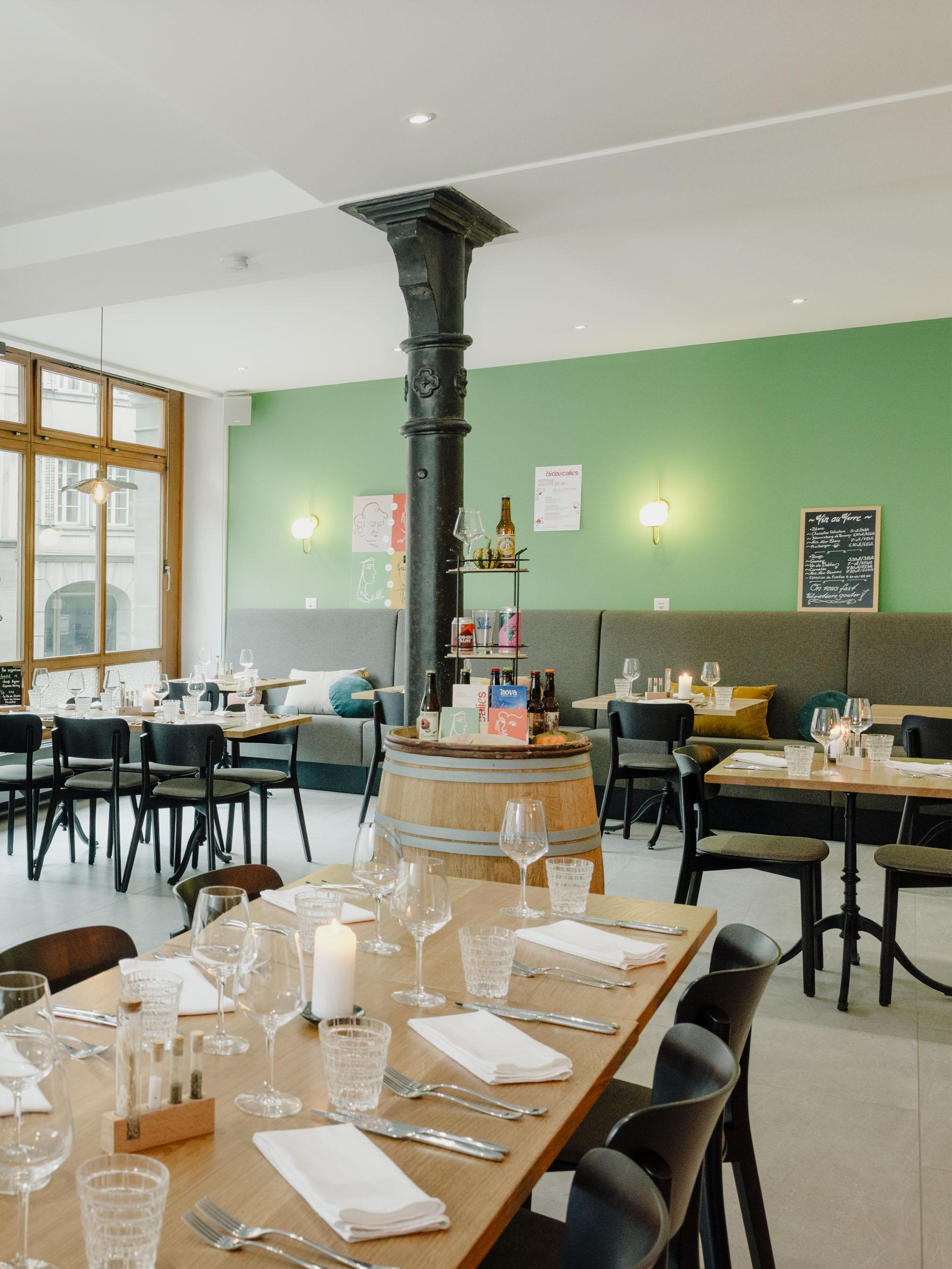 Salle à manger calme, intimiste, se transformant en bar animé lors de concerts et événements